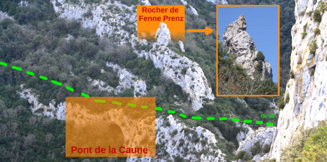 Lors de la randonnée sur le GR 36 et/ou sur "La boucle de Nitable Roc", lorsque qu'après la montée pentue, l'on se retrouve au-dessus des rochers, avec une belle vue dégagée, là, et ce n'est pas toujours perceptible... l'on emprunte un pont naturel ! Le pont de la Caune... qui a donné le nom de Coynepont.