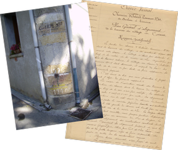 Sur votre sentier, entre le parking et le village... un panneau noir matérialise les ruines d'une maison. C'est le témoignage de la terrible inondation de septembre 1892. Cette année là, le niveau de la rivière est monté de plus de 3 mètres, détruisant cette maison construite en 1887 par Frédéric VIE et dont il reste encore le four à pain à la voûte en tuiles (que vous pouvez voir), ainsi que la porcherie, petit local voûté à côté de la maison.